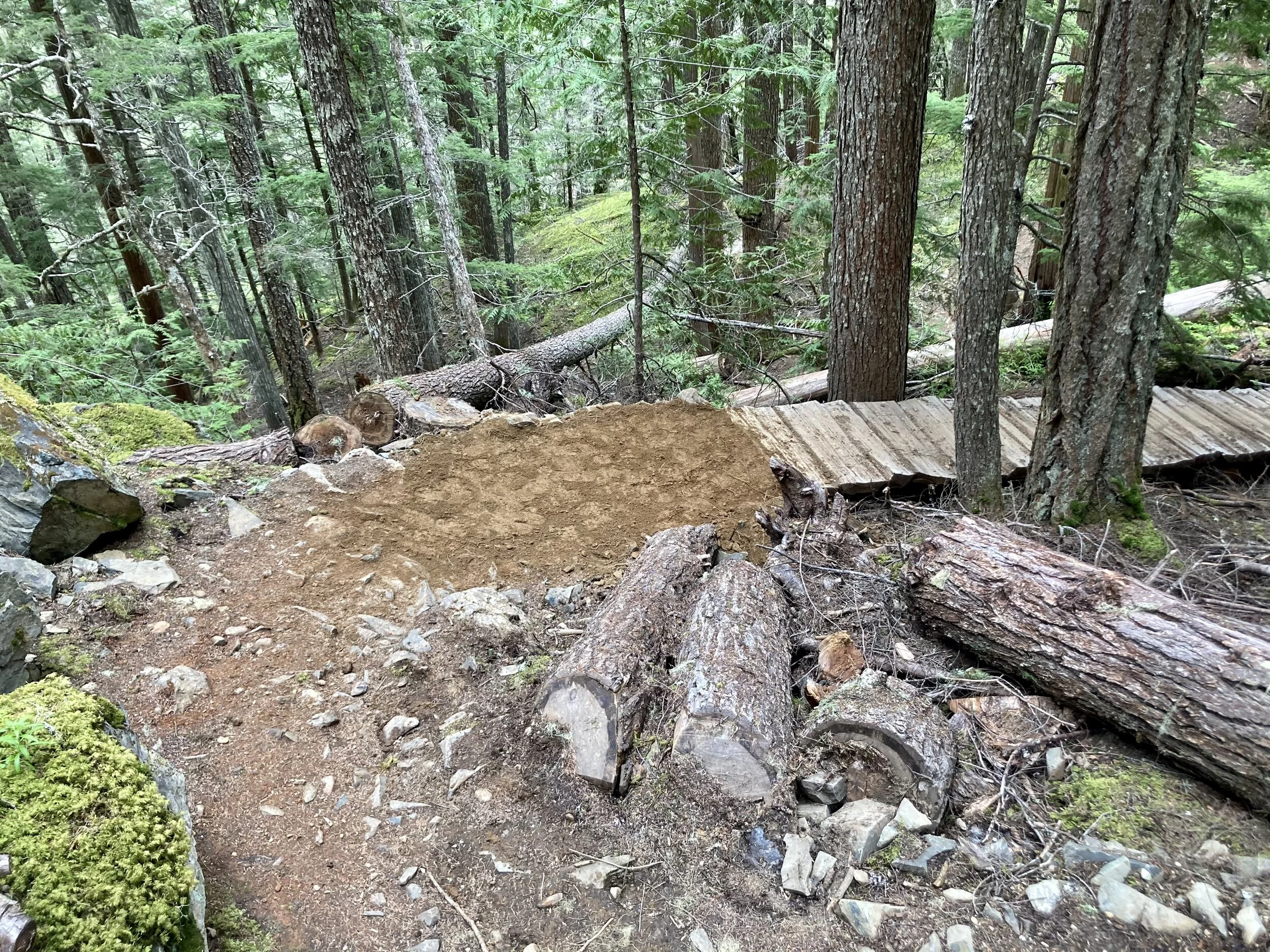We spent a few more days re-working the upper part of the trail, armouring holes and widening precarious moves that have no business on a blue descent. Using it as a climb will still be rated black due to its overall steepness.