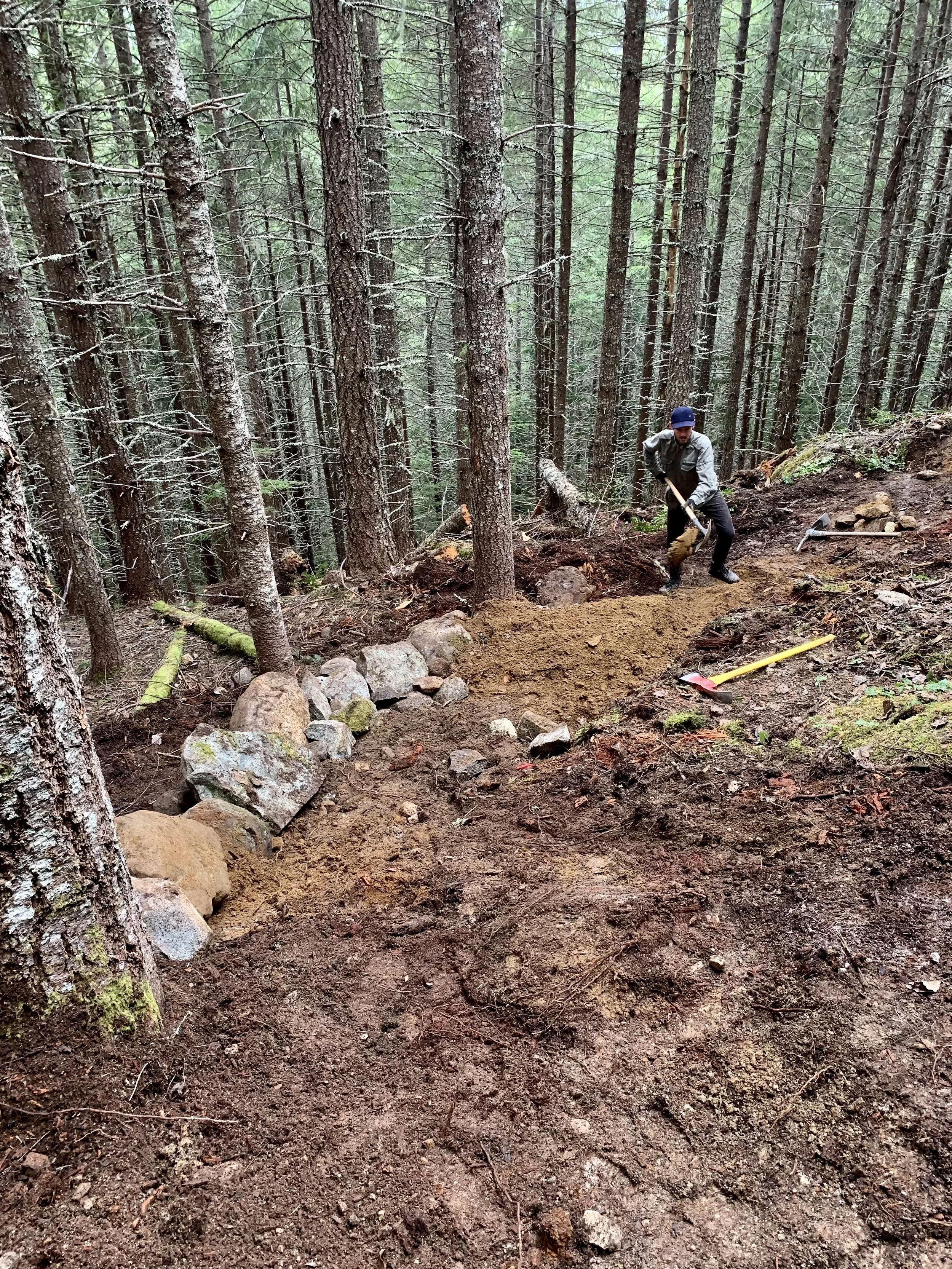 Another session of the Whistler Adventure School Sustainable Trail Building program got going this week and our classrooms were scattered in the lower Sproatt zone. The Students learned (and practised), route selection, water management, bench-cutting, rockwork, using specialty tools and signage. You’ll find some of their homework at the bottom of Industrial Waste… Can you spot the changes?