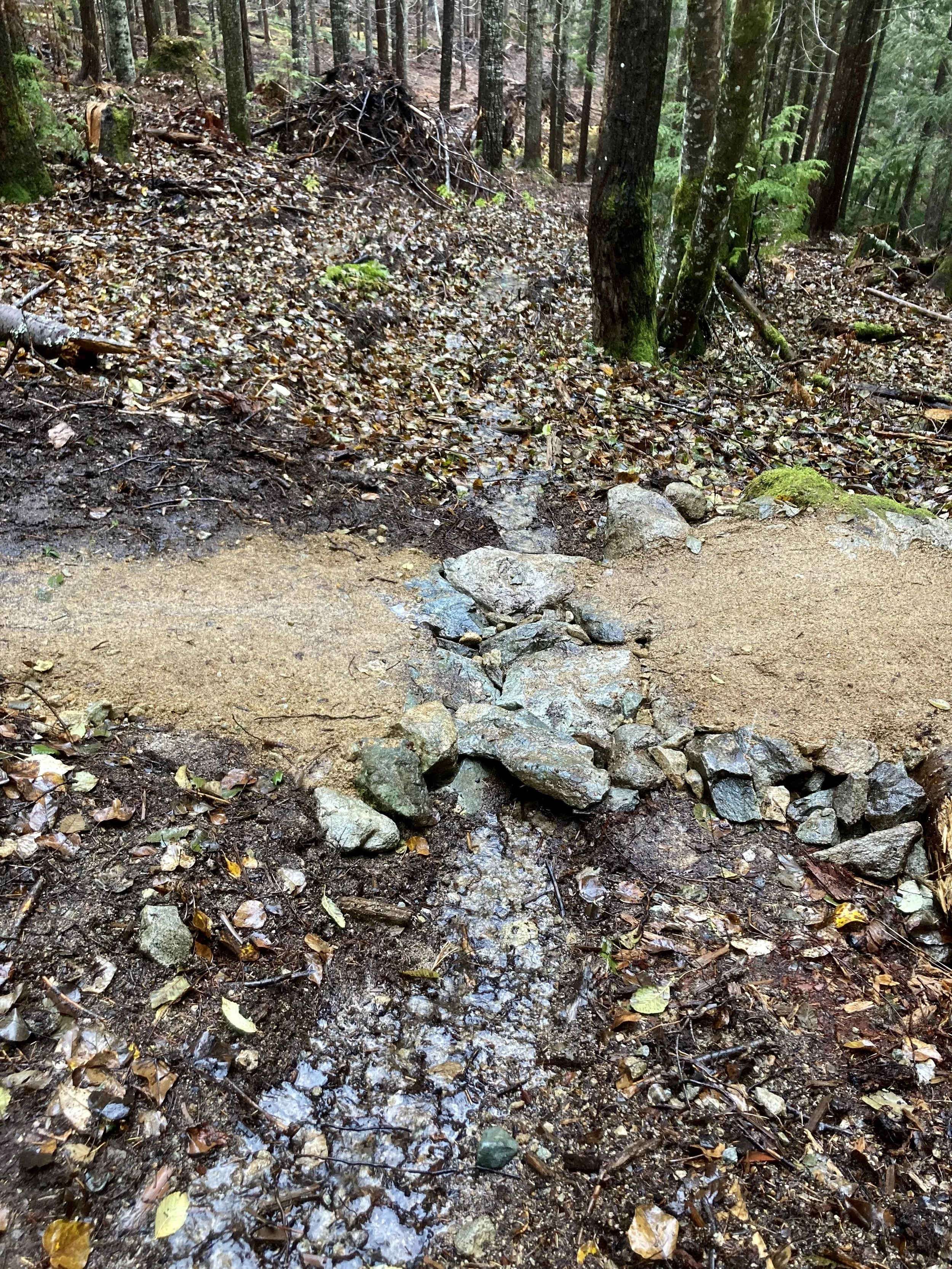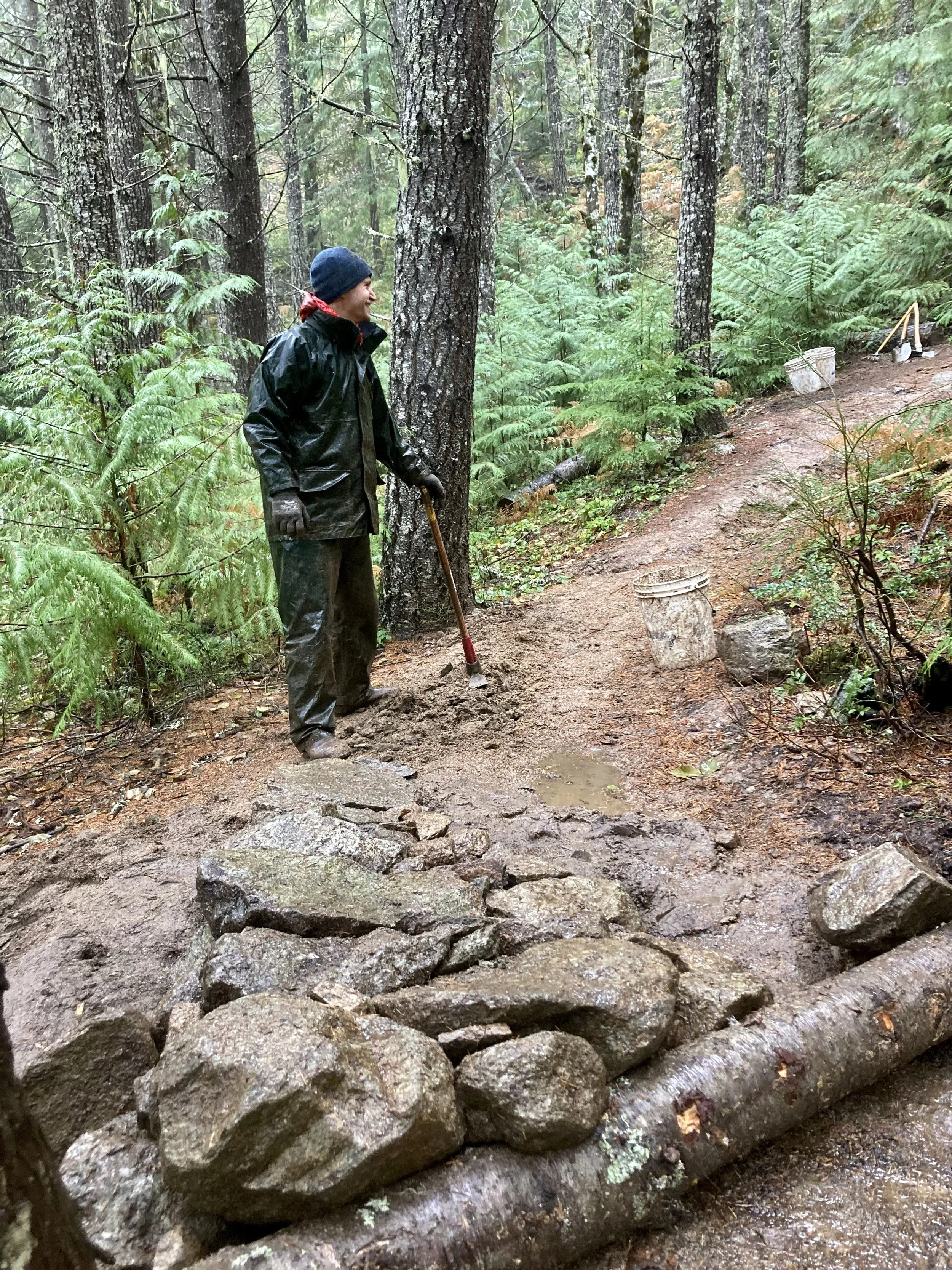 At the end of the day, wet and chilled to the bone, Liam said these repairs felt like playing whack-a-mole: every time we got water off of the trail, it re-appeared at a different spot. Indeed. We then bumped into my friend Claire who was walking her dogs, she likened AM/PM to a colander. Very astute.