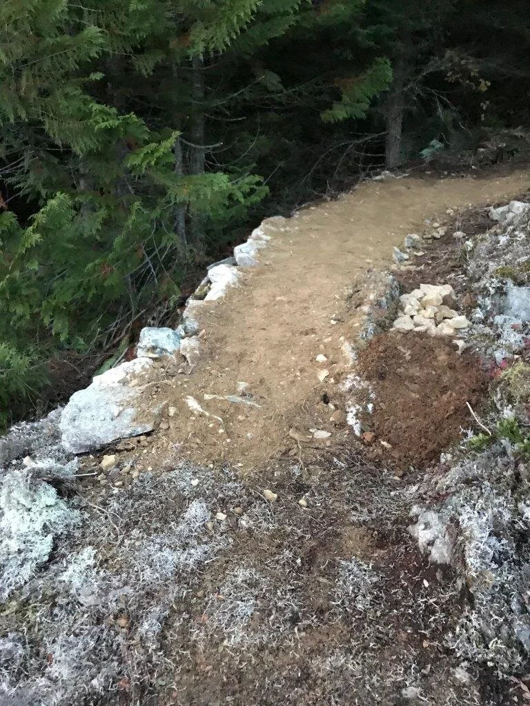 Santa Cruz Bikes sponsored a heated final party for 34 folks who braved the cold to work up a sweat. The trail isn’t quite ready for tires yet, although, we managed to de-duff the remaining 100 metres of the Piece of cake extension. … The trail crew will work out the finishing touches on it in the next few weeks (when it’s too cold and rainy-snowy to work at higher elevation)