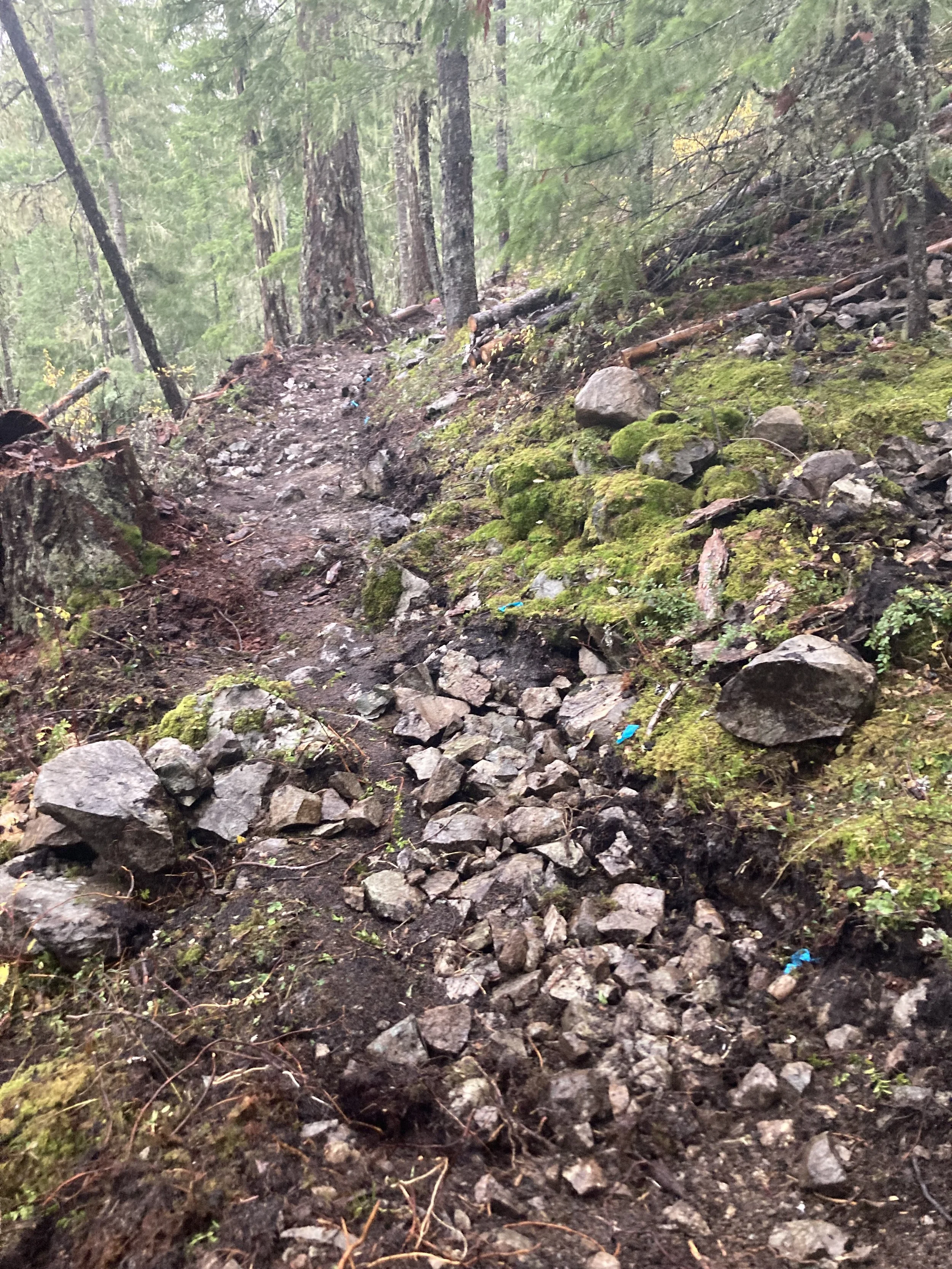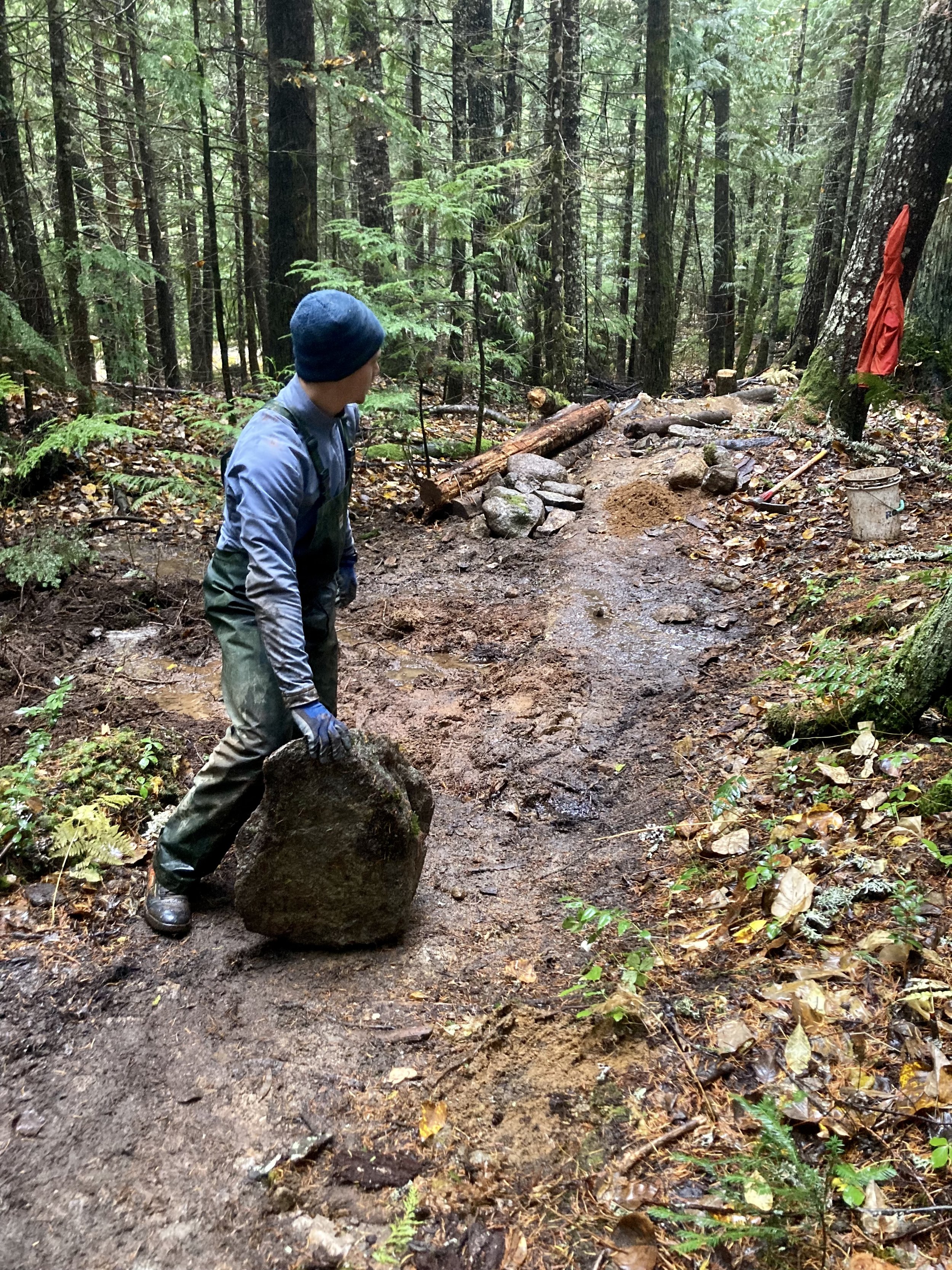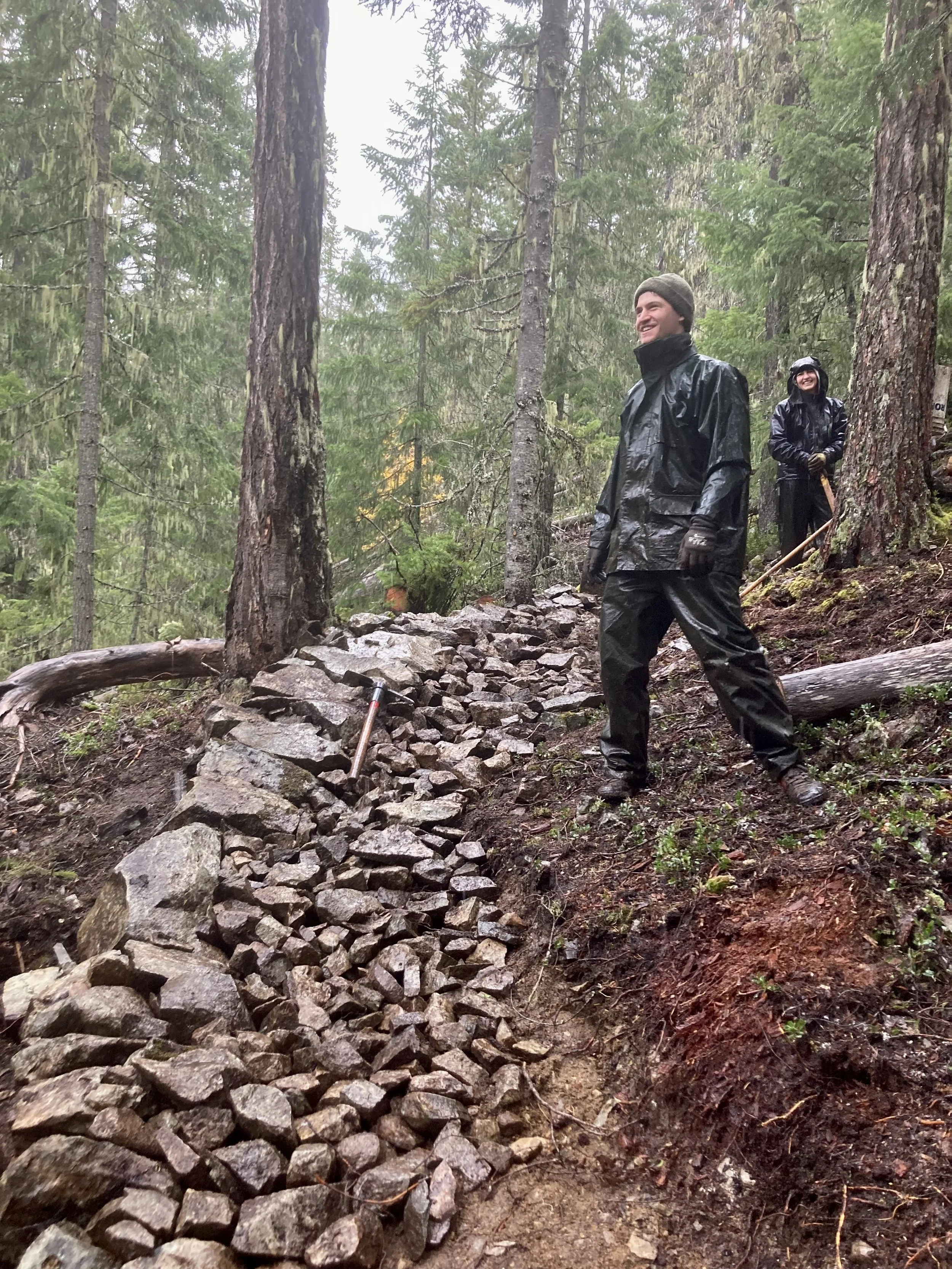 While the students moved mountains of duff, rock and dirt, Liam and Renee were constructing the crux of the project: a switchback (through a boulder field).