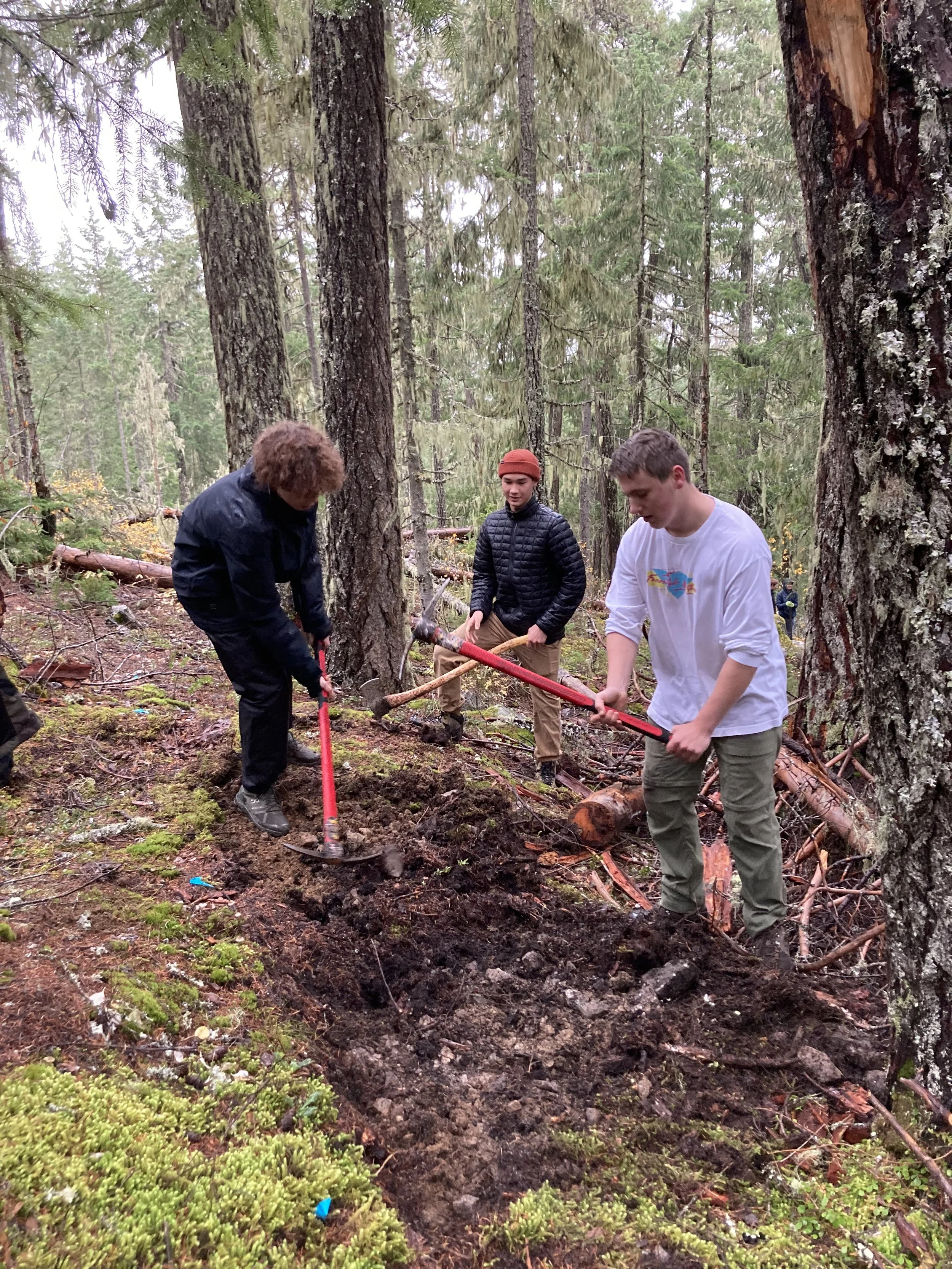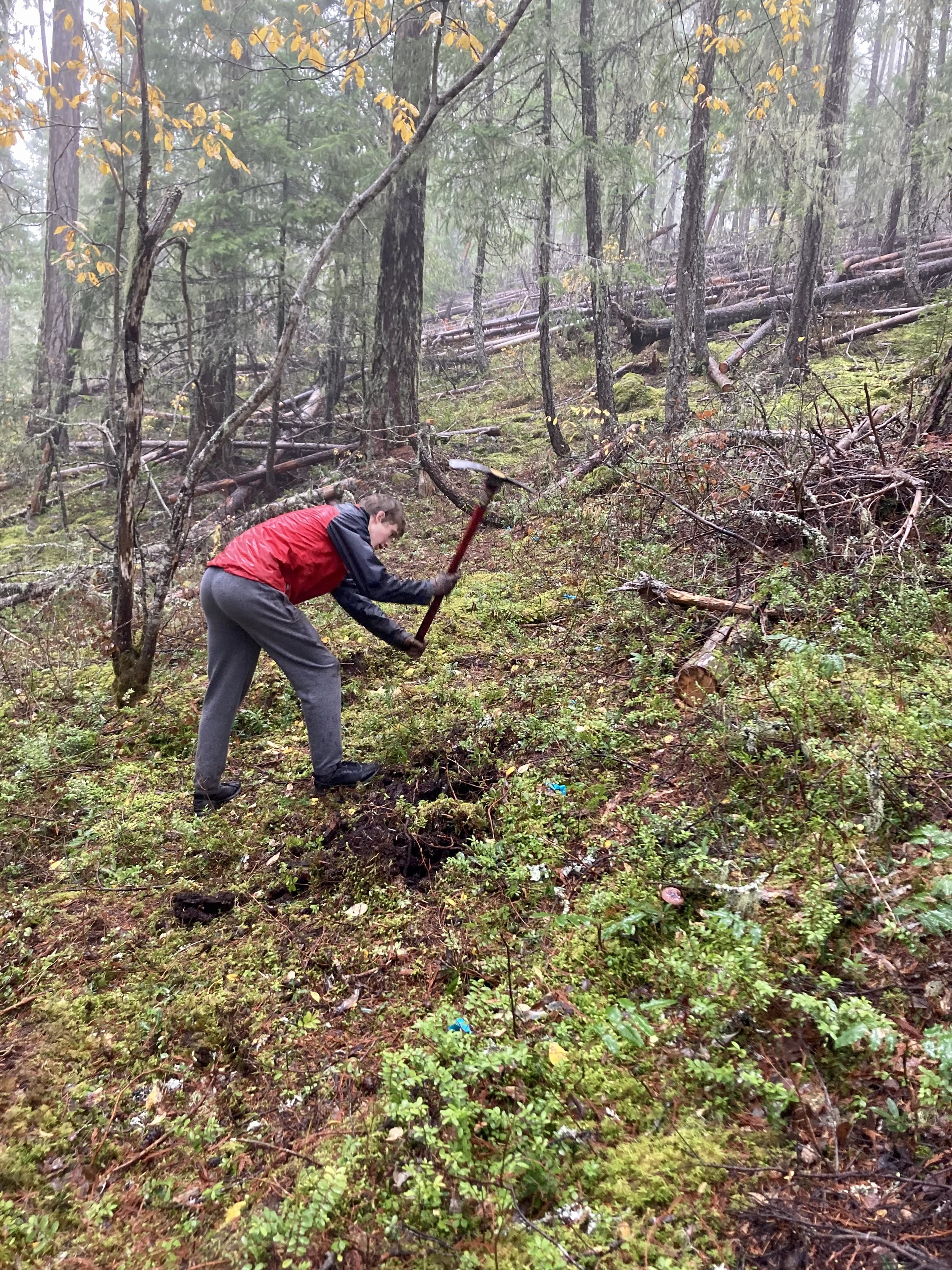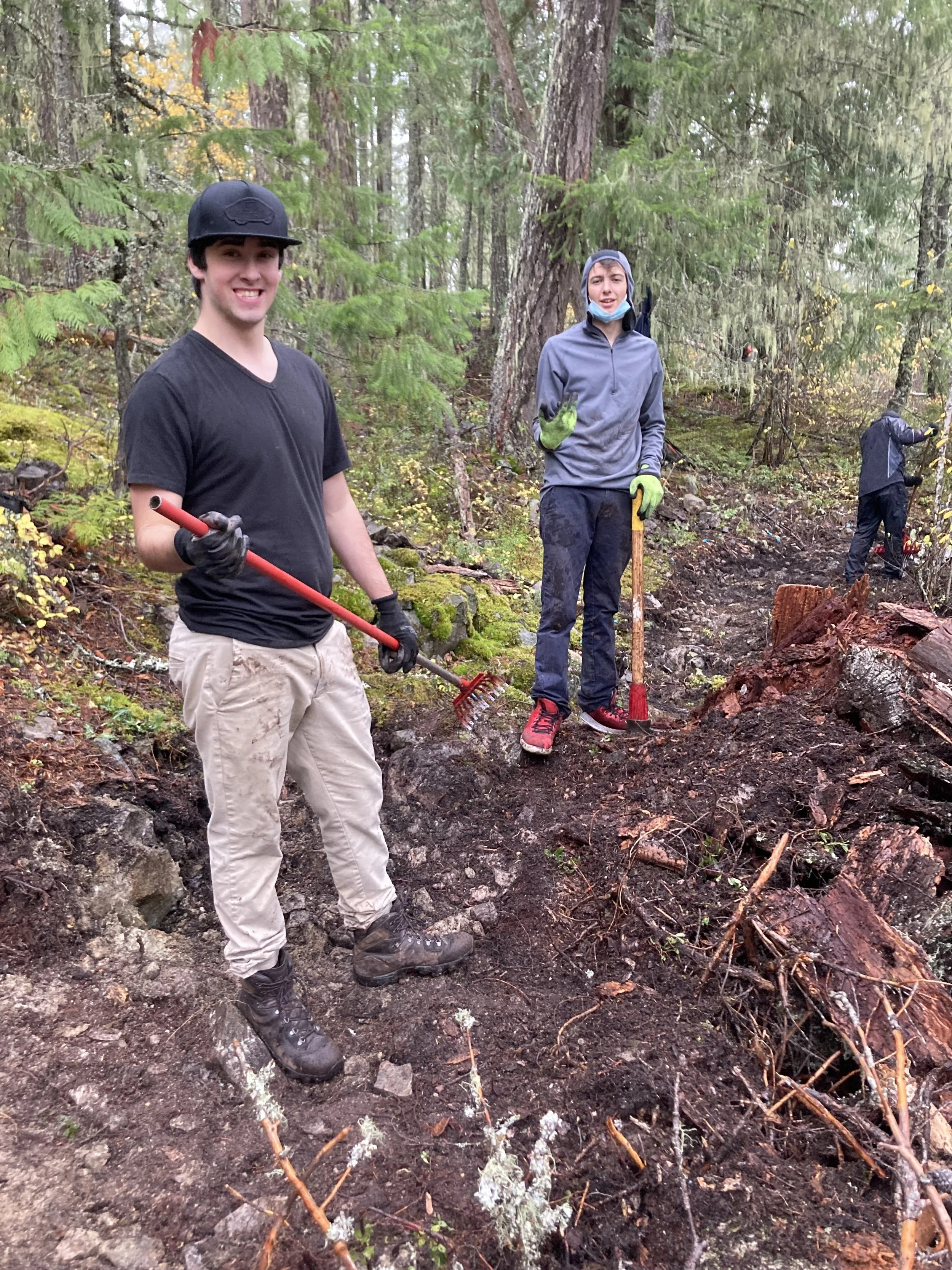 While the students moved mountains of duff, rock and dirt, Liam and Renee were constructing the crux of the project: a switchback (through a boulder field).