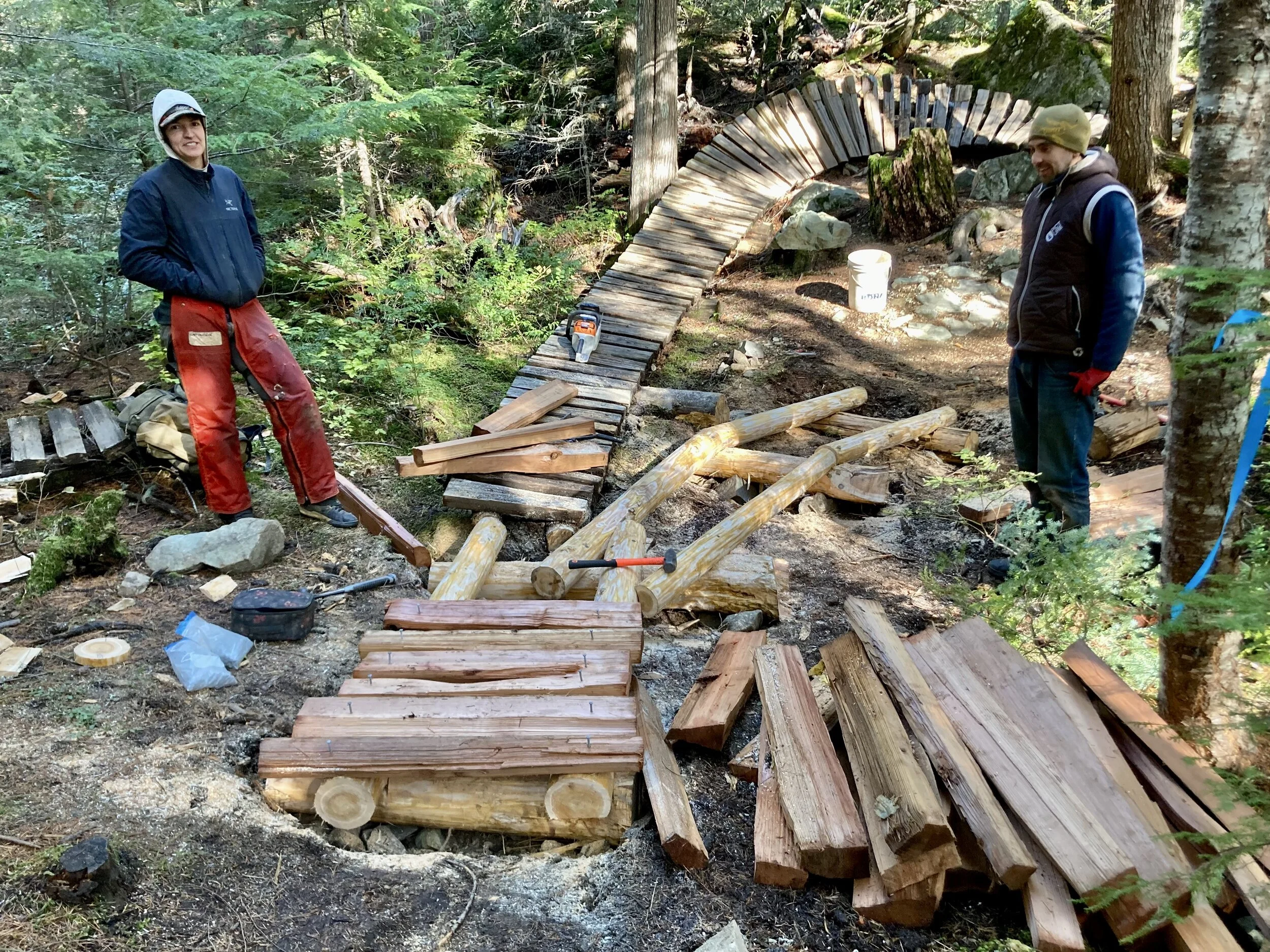 While making work plans for the week, Renee and I discovered a broken bridge on Danimal North… this immediately jumped to the top of the priority list. Luckily, we had enough decking leftover from Delineator to replace the bridge in a snap. The cold weather is really testing the batteries on the electric saw...