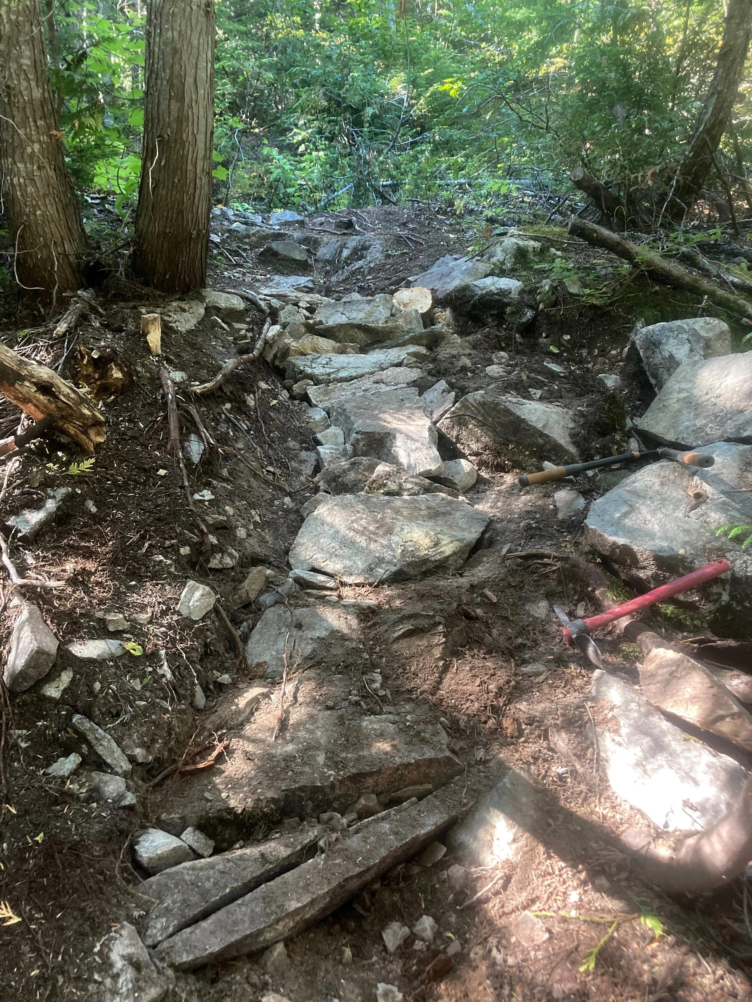 Well rested (maybe a little tired actually) from tons of vacation riding, the trail crew is back in action (Renee too!). Summer is finally here so we’re shifting gears from building bridges to dry stacking rocks.
